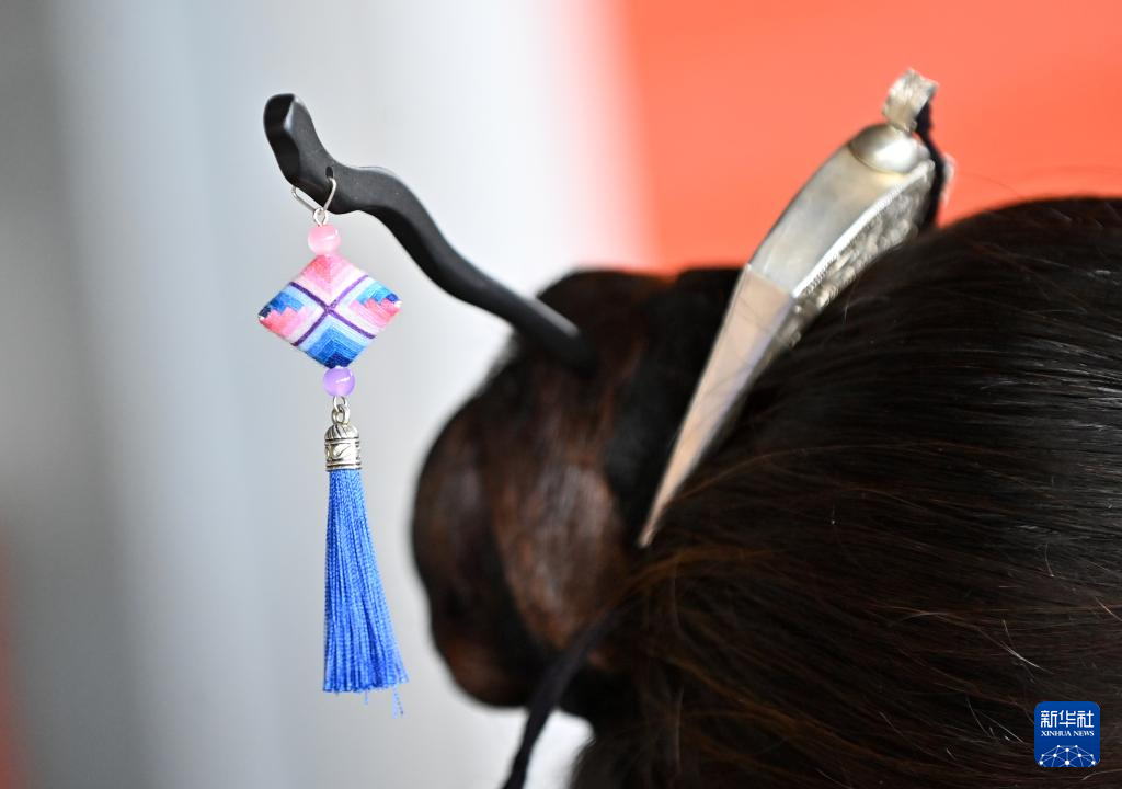 9月24日,在广西三江侗族自治县八江镇三团村,当地村民佩戴侗族吉祥花耳饰。