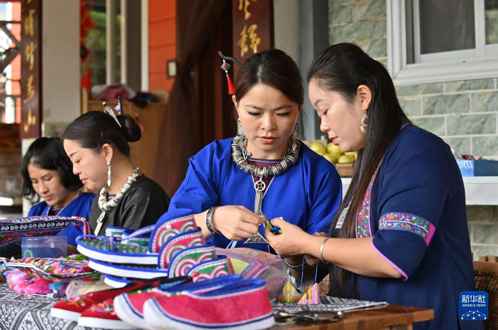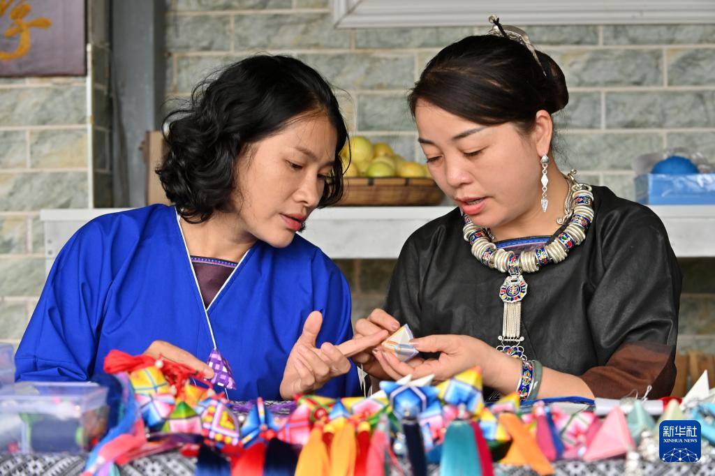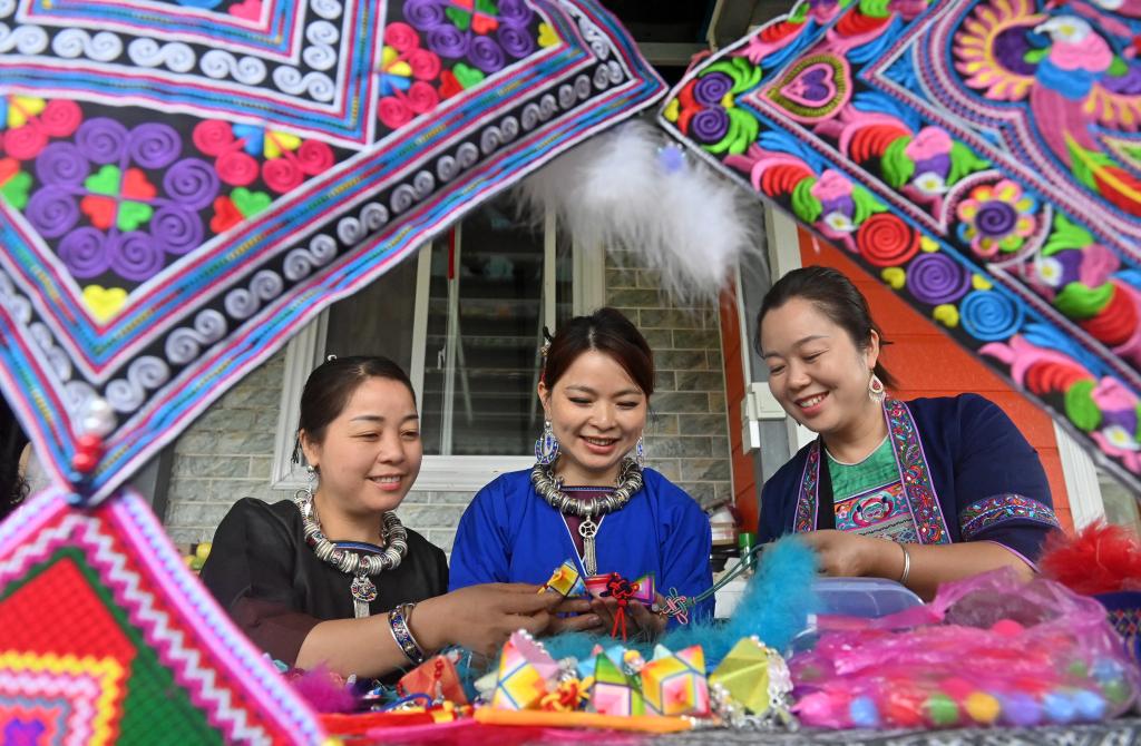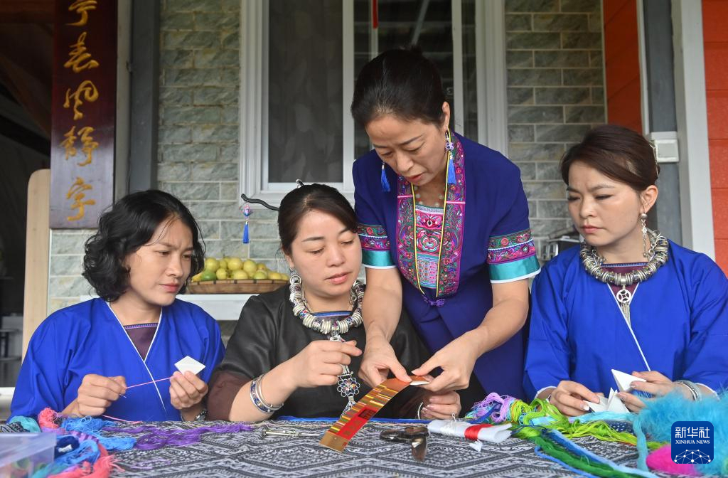 9月24日,在广西三江侗族自治县八江镇三团村,当地村民探讨侗族吉祥花制作技艺。