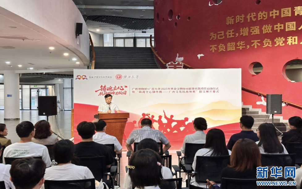新华网南宁9月25日电(王奕初)25日,“铸魂立心·抗战精神进校园”——广西博物馆×广西大学革命文物协同教育实践项目启动仪式在广西大学大学生活动中心举行。