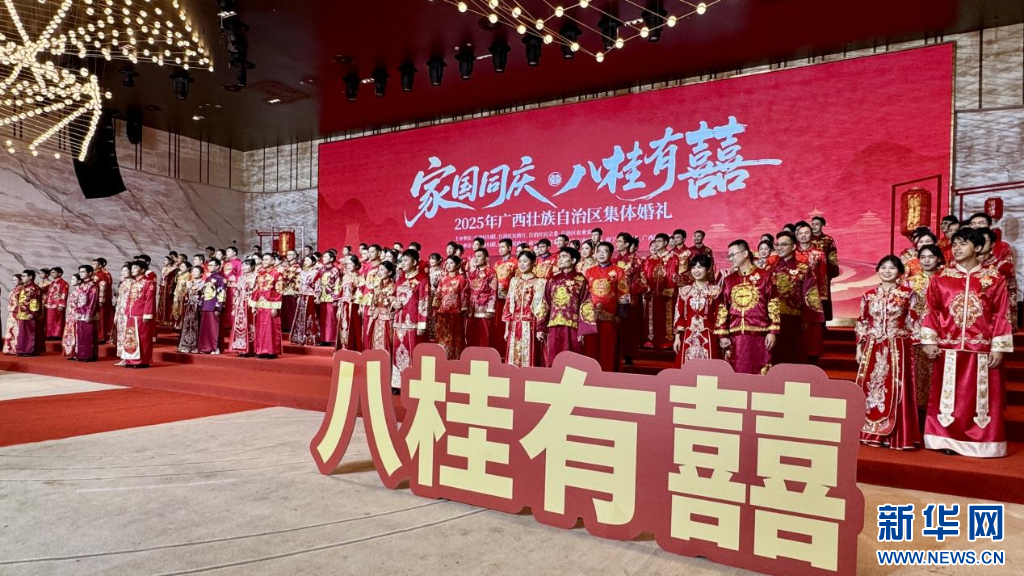 新华网南宁9月28日电 26日,2025年“家国同庆 八桂有囍”集体婚礼在广西南宁国际会展中心举行,56对新人携手参加婚礼仪式,近400名嘉宾与新人家属到场见证。