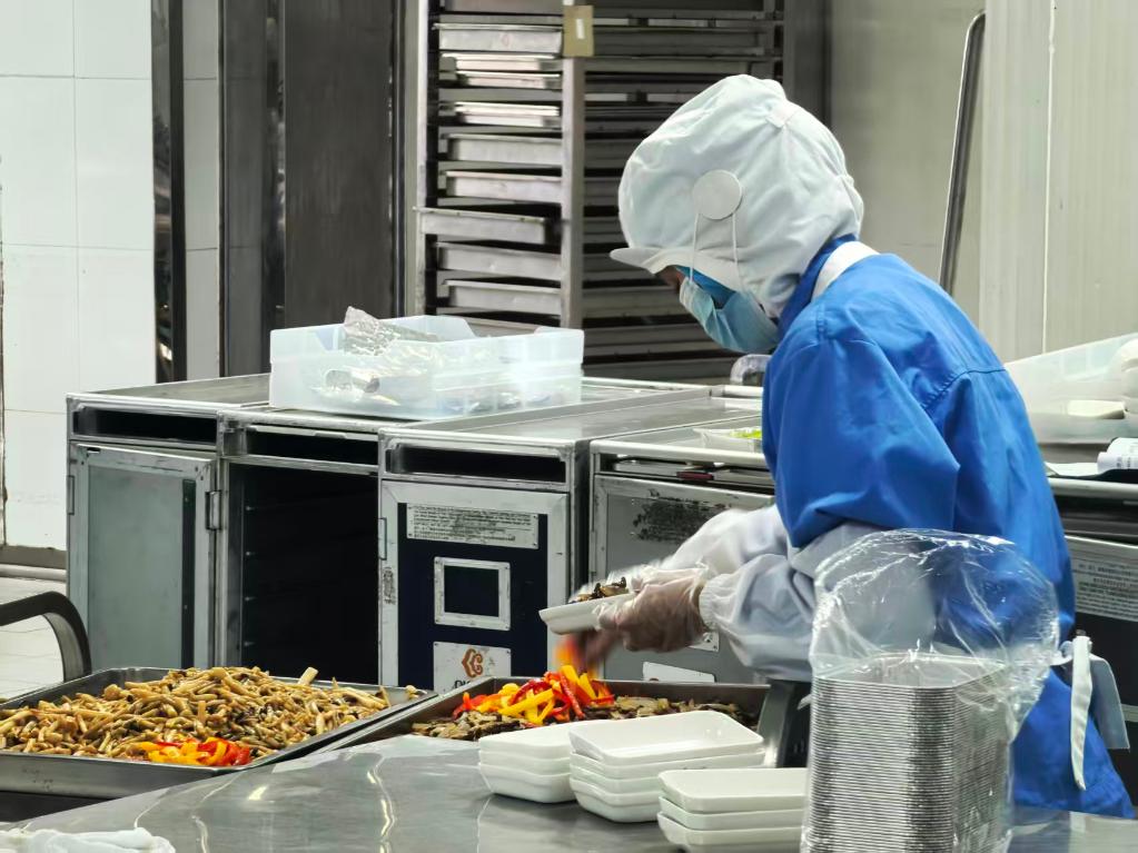 走进公司餐食包装区里,“全副武装”的餐食包装员熟练地在餐盒内摆放主食、配菜,再仔细贴上标签、封好盒盖。“工作人员在进入后厨、包装区等高保洁区域前均经过了严格的消毒措施,确保餐食干净安全无污染。”广西翔飞航空食品有限公司党支部书记丁凤军说。