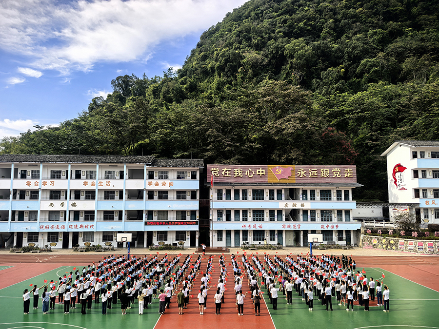 阳朔镇第二中学举行升国旗仪式。陈曦文 摄