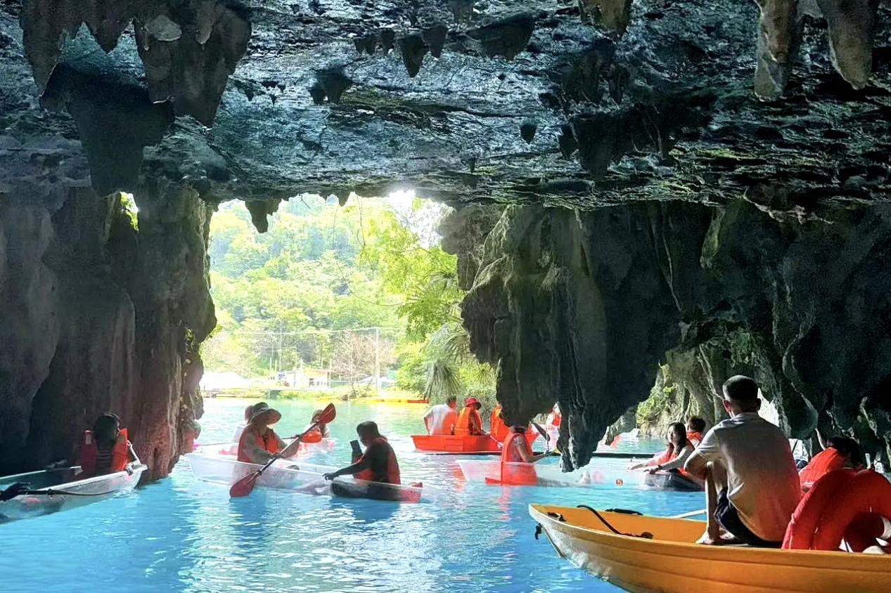 在土博镇水源村木贯屯的狼口泉景区,“秘境溶洞+碧波泛舟”吸引众多游客前来游玩。游客黄晓说:“天然空调房名不虚传,钟乳石与水中倒影太震撼,镜头每按一次都是屏保。”。