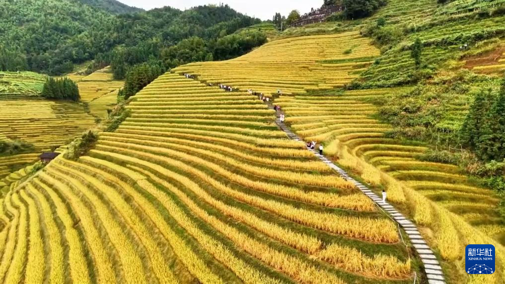 从高处俯瞰,漫山遍野的稻谷成熟了,一层层、一环环从山脚盘绕至山顶。
