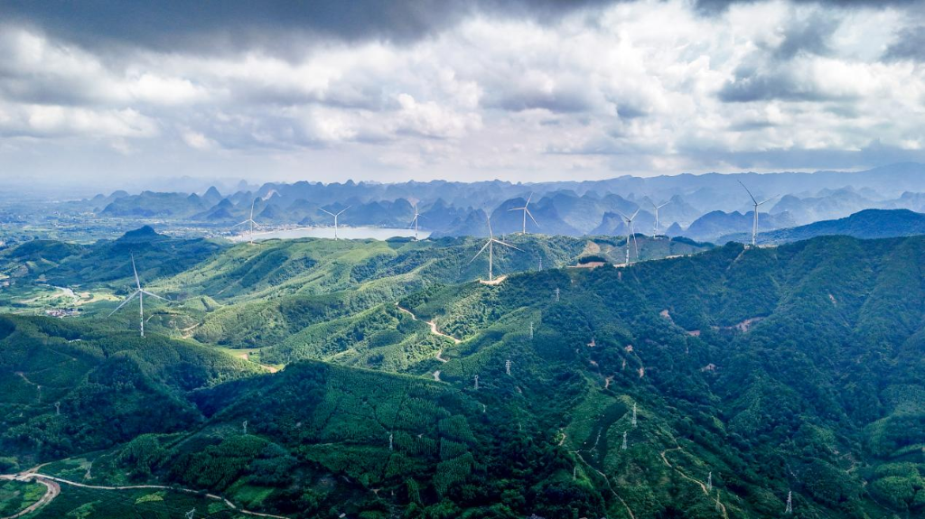 在桂林市永福县堡里镇广福乡的山麓间,国能永福公司336兆瓦风力发电项目的巨型风机在云雾间徐徐转动,为“风光火储一体化”基地持续供能。