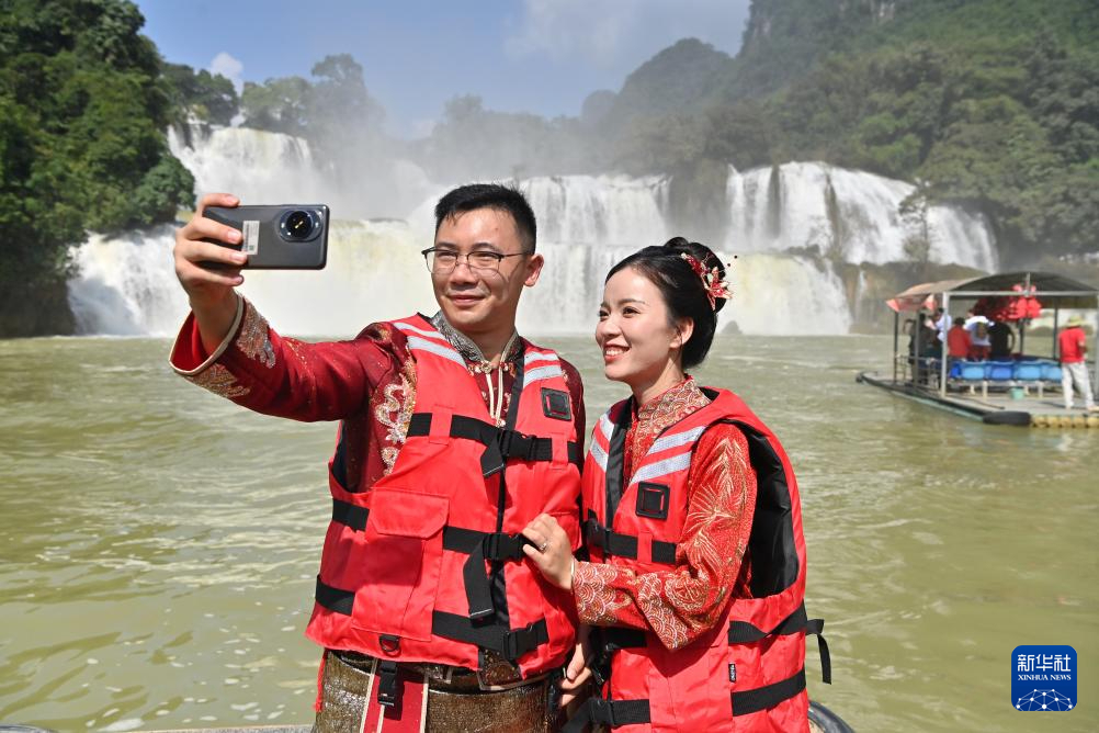 10月18日,一对新婚夫妻在中越德天(板约)瀑布跨境旅游合作区自拍。