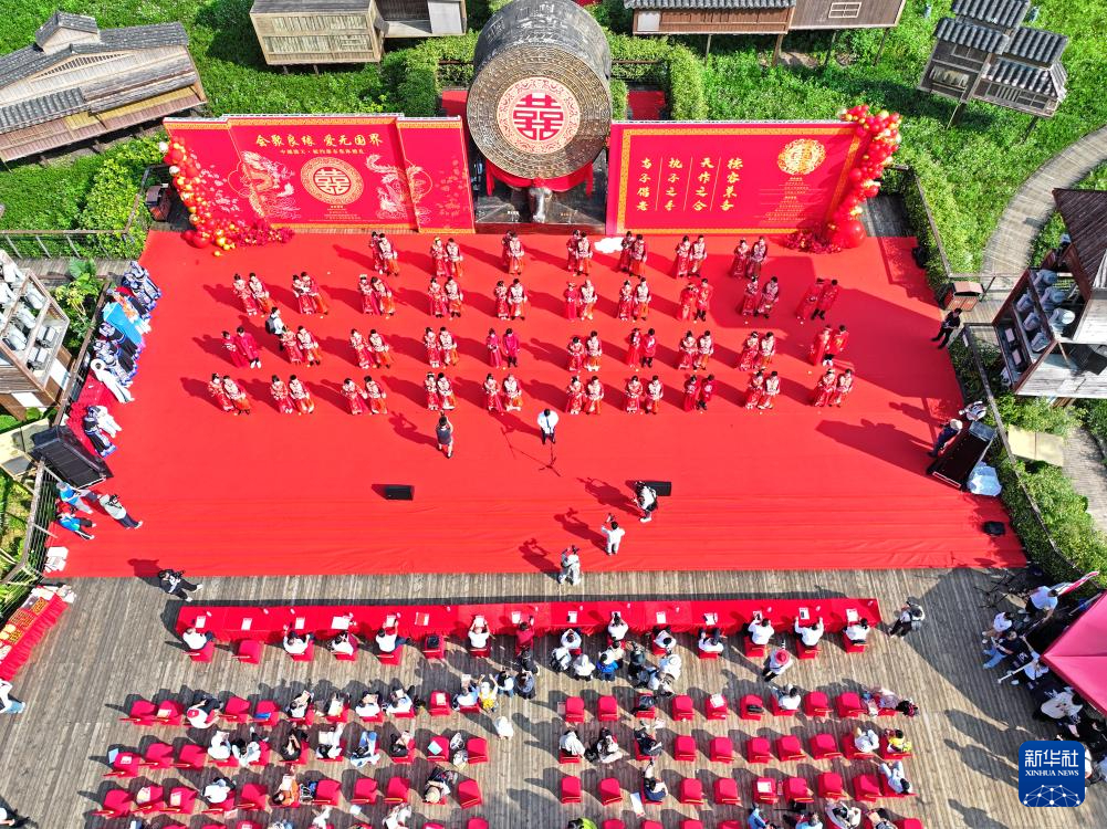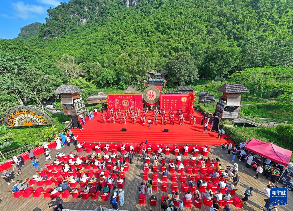 这是10月18日拍摄的中越德天(板约)瀑布集体婚礼仪式现场(无人机照片)。