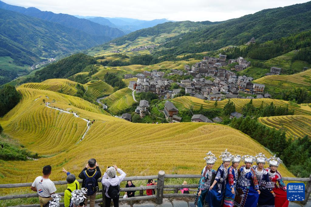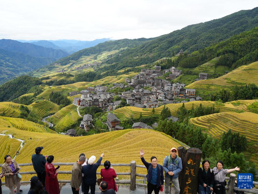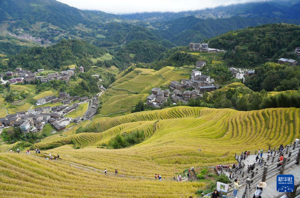 十月的广西,秋意正浓。位于桂林市龙胜各族自治县的龙脊梯田稻浪翻滚,漫山遍野的金黄稻穗沿着山势层层铺展,吸引游客拍照留念。
