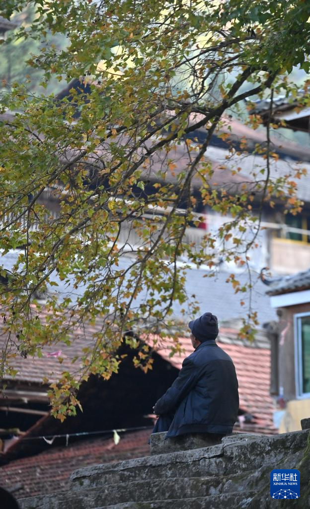 在广西柳州市融水苗族自治县杆洞乡乌英苗寨,老人在树下休息(2024年11月7日摄)。