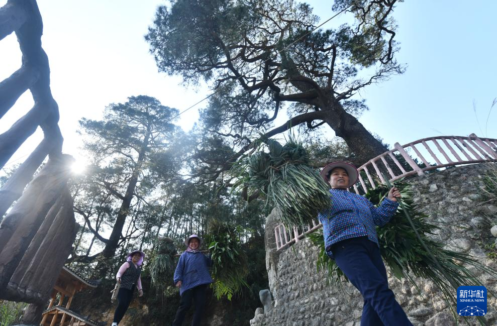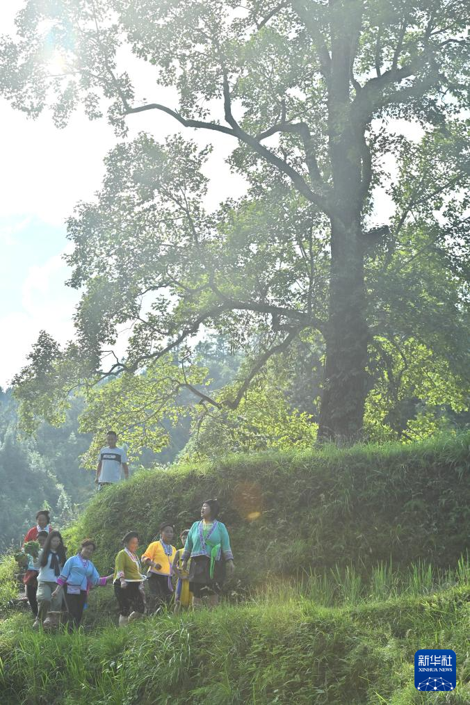 在广西柳州市融水苗族自治县安太乡元宝村,劳作归来的村民从树下经过(2025年3月20日摄)。