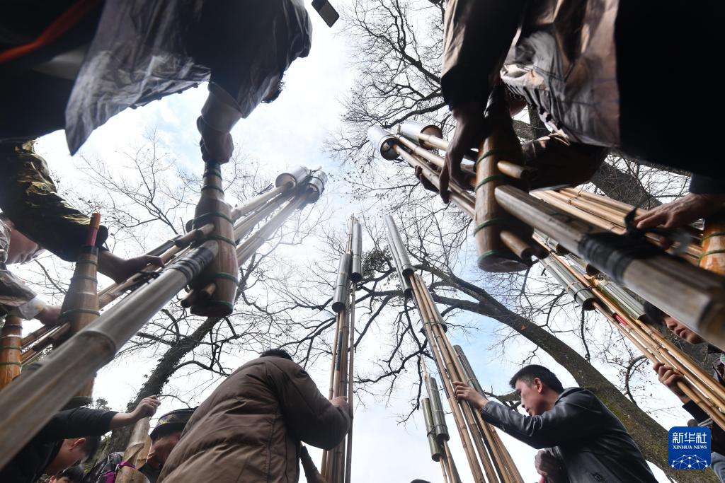 在广西柳州市融水苗族自治县杆洞乡乌英苗寨,村民们在树下吹芦笙,欢度春节(2025年1月29日摄)。