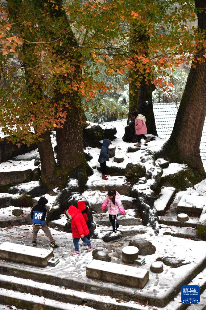 在广西柳州市融水苗族自治县杆洞乡乌英苗寨,孩子们在树下玩雪(2021年12月26日摄)。