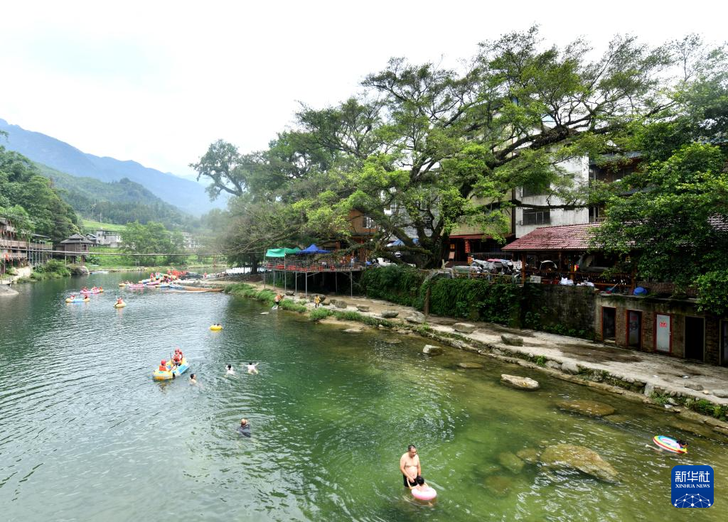 在广西柳州市融水苗族自治县香粉乡雨卜村,游客在树旁的河里戏水(2025年7月20日摄)。