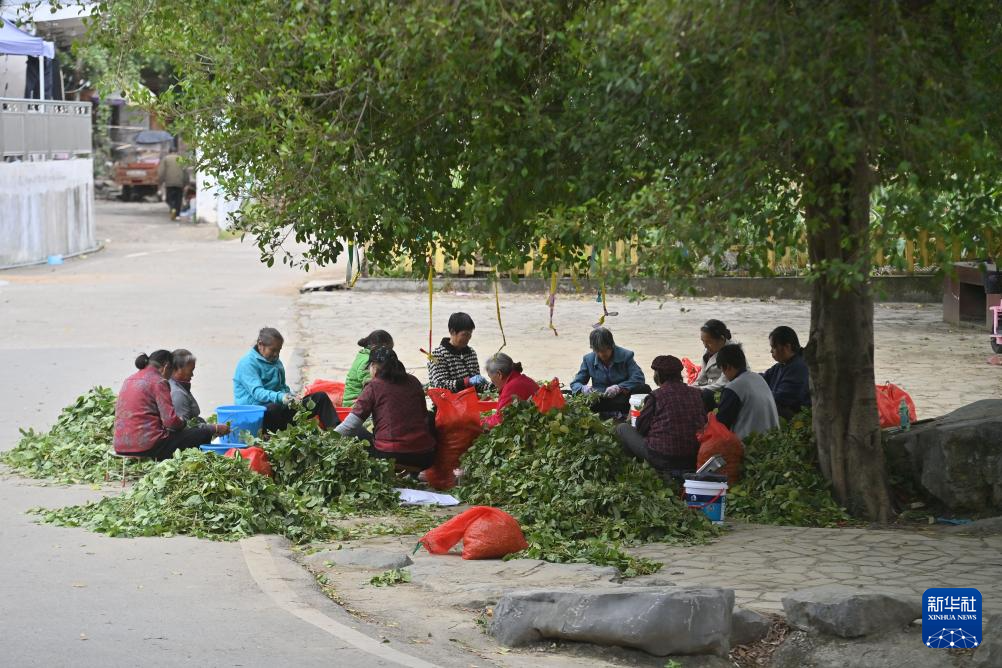 在广西柳州市柳江区三都镇觉山村,村民们在树下挑选蔬菜,准备销往市场(2025年10月21日摄)。