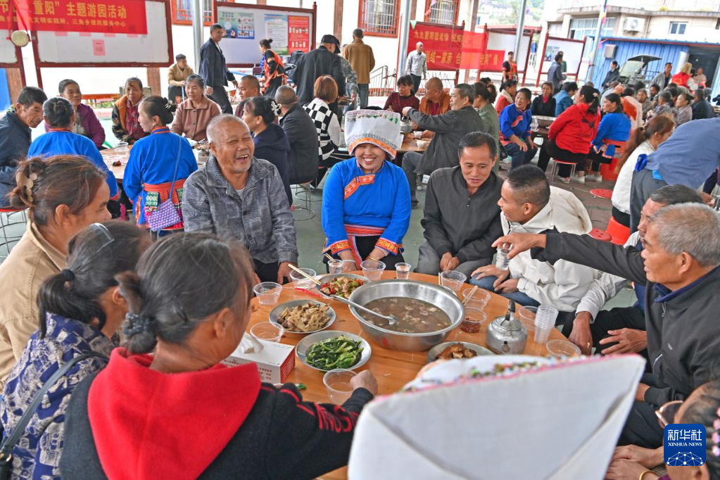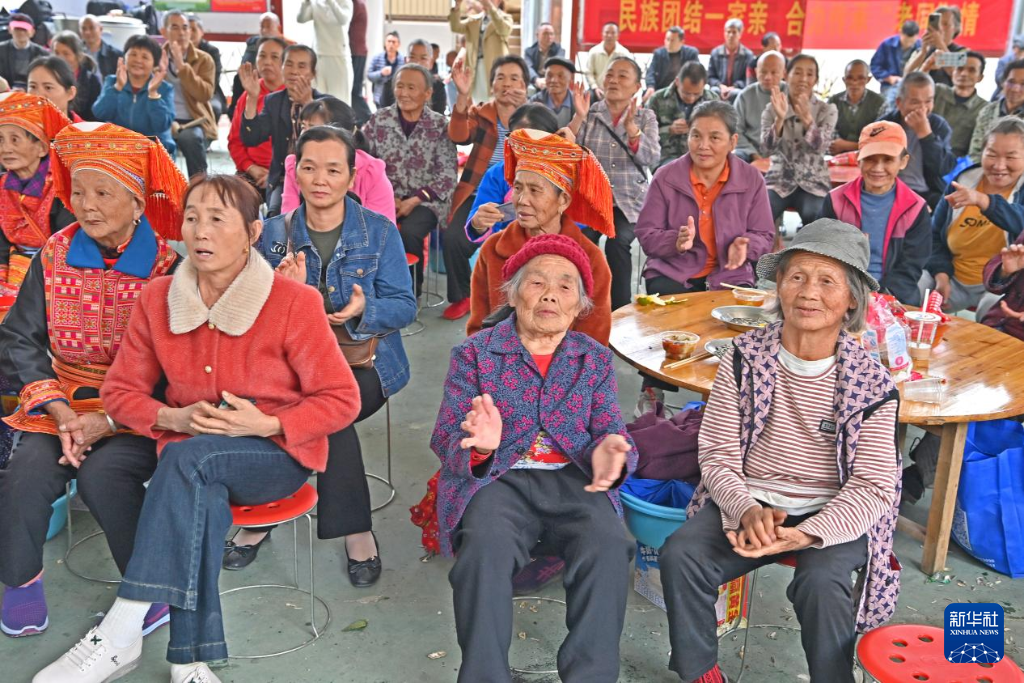 10月29日,两地群众在广西金秀瑶族自治县三角乡六定村一起欢度重阳节。新华社记者 周华 摄