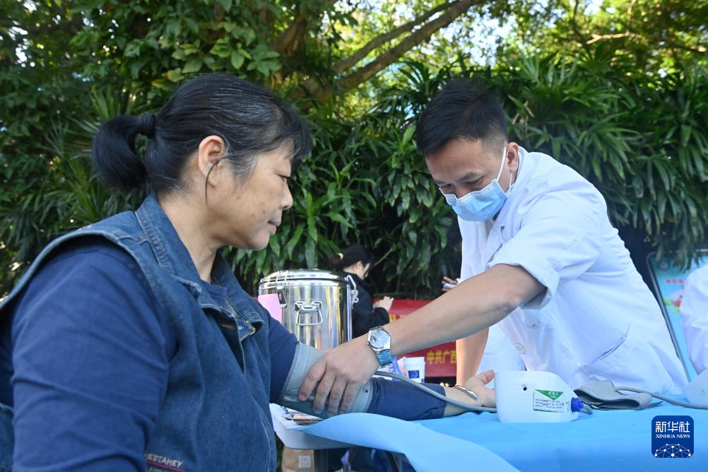 11月14日,在广西南宁市金花茶公园,医务工作者为市民测量血压。