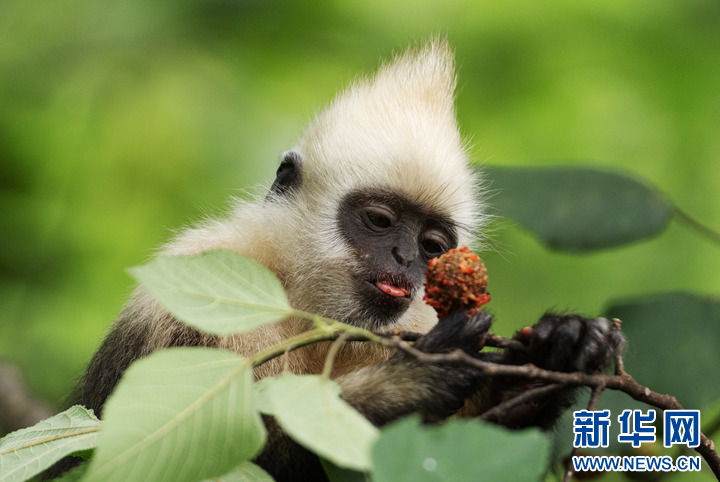 一只白头叶猴在吃构树的果实。新华社记者费茂华 摄