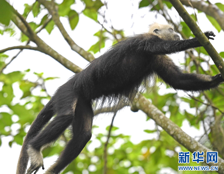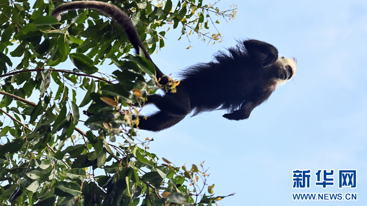 一只白头叶猴在林间跳跃。新华社记者周华 摄