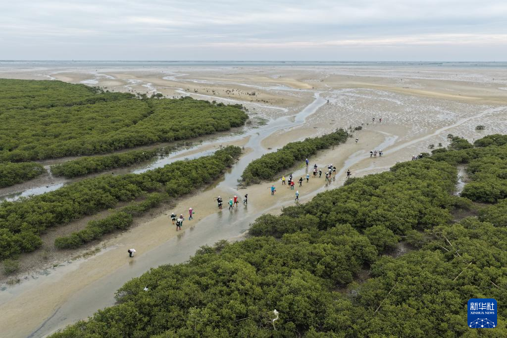 在广西北海金海湾红树林生态旅游区内,3000多亩红树林宛如一片“绿海”,白鹭翩飞,虾蟹成群。红树林,这种扎根于海岸潮间带的胎生木本植物,既可防风消浪,又能净化海水,还为鱼虾鸟类提供栖息之所,素有“海上森林”“海洋卫士”之称。潮水退去后,人们常常带上赶海工具前往滩涂,寻找大自然的馈赠。