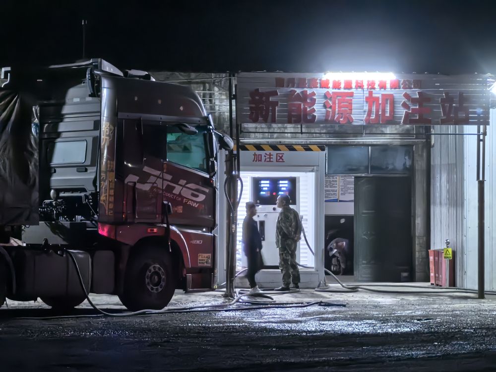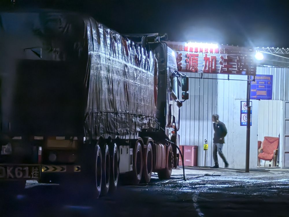 广西G210国道旁,一处“新能源加注站“在深夜为往来货车加注燃料(记者王楚然 摄)