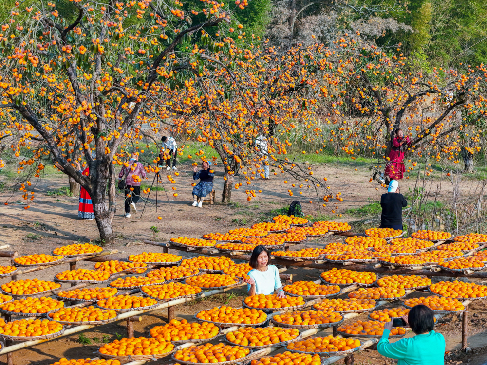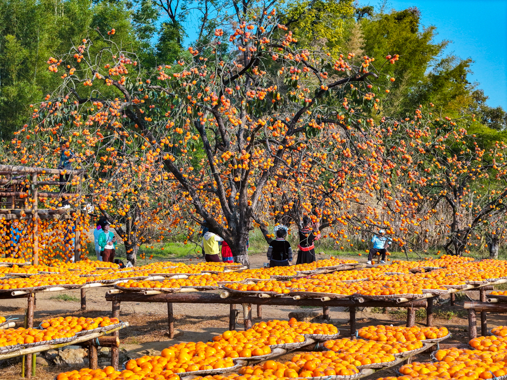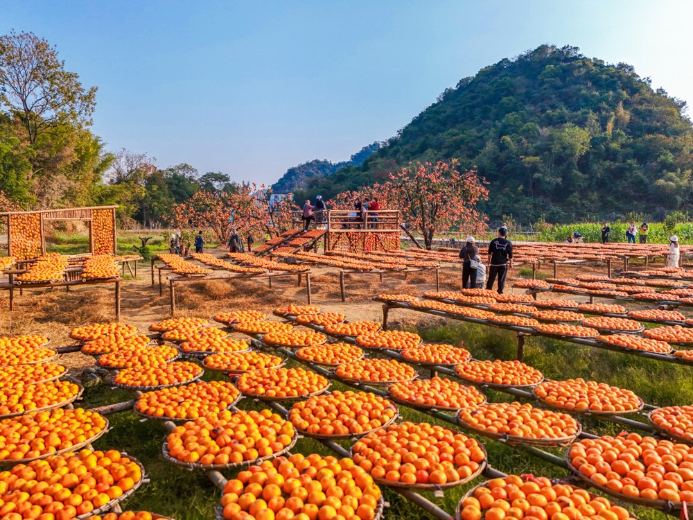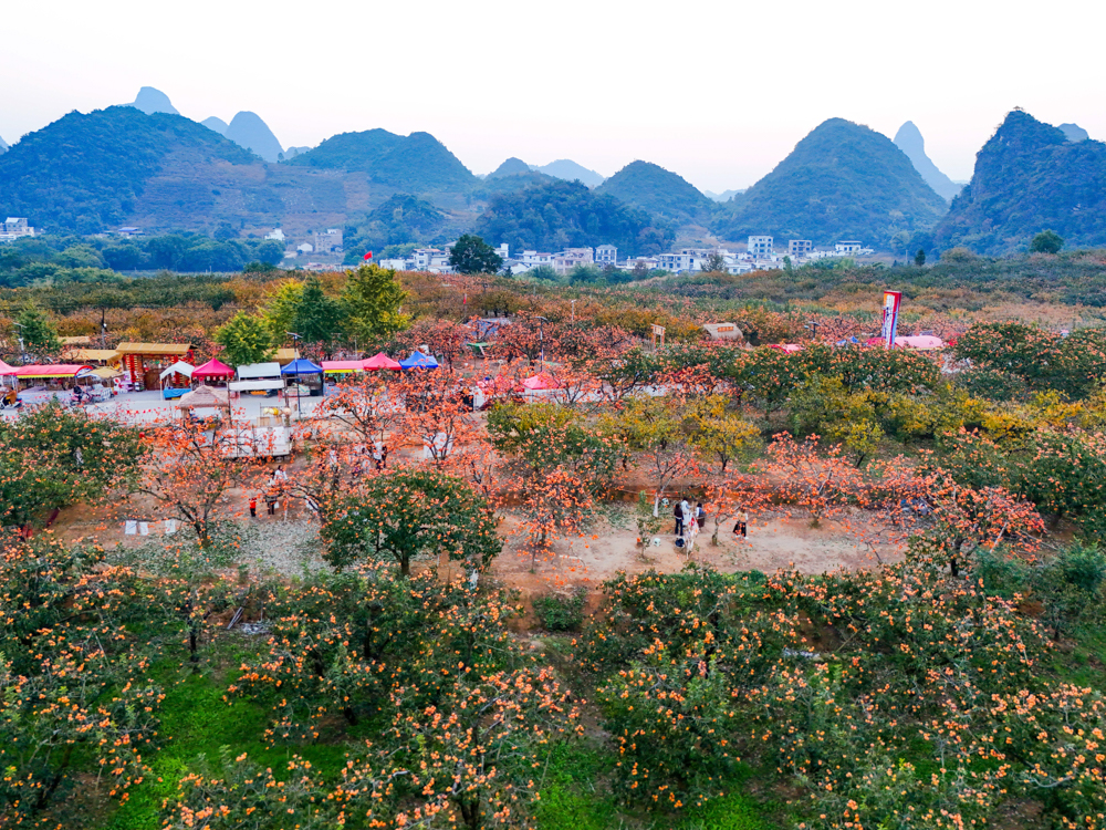 冬日时节,广西桂林市恭城瑶族自治县莲花镇红岩村万亩柿林进入最佳观赏期,游客纷至沓来,感受丰收的喜悦。