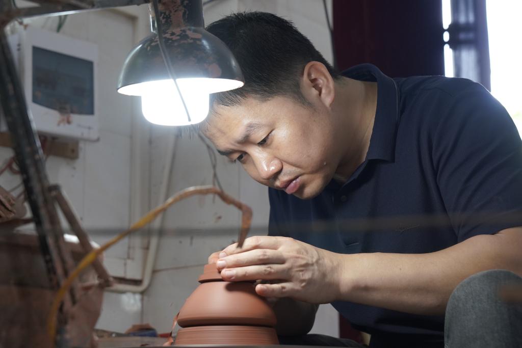 如今,他的工作室仍以家庭作坊形式运作,父母、妻子和亲戚共同参与,按订单生产,产品销往广东、北京等地。他还常在网络平台上分享孩子制作坭兴陶的视频,受到网友喜爱。“孩子从小就在这样的环境中长大,自然会产生兴趣,我希望这份热爱能够被保护和传承下去。”