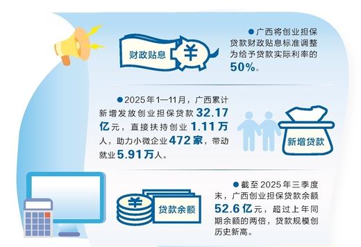 据统计,2025年1—11月,广西累计新增发放创业担保贷款32.17亿元,直接扶持创业1.11万人,助力小微企业472家,带动就业5.91万人。
