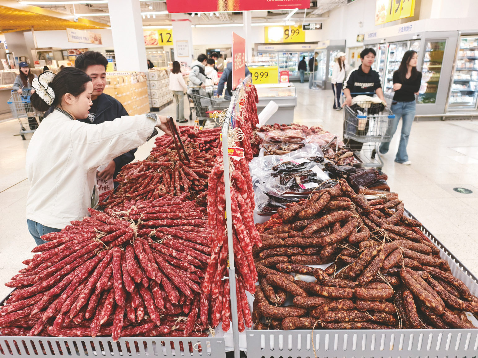 市民在超市选购腊味。