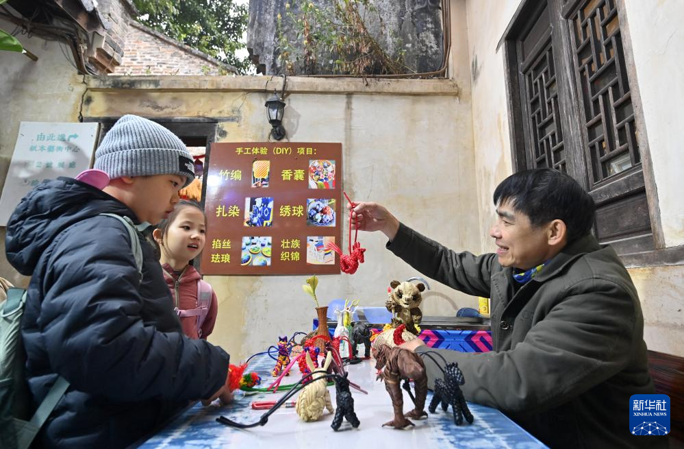 1月21日,在广西南宁市三街两巷,潘武向两名小朋友介绍自己编制的马形小饰品。