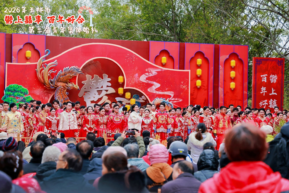 新华社客户端南宁1月22日电 22日上午,玉林市“鬱上囍事 百年好合”第三届青年集体婚礼在南流江江心岛温情启幕,100对新人许下相守一生的诺言。市委书记王琛现场证婚送祝福,见证青年幸福与城市发展的双向奔赴。