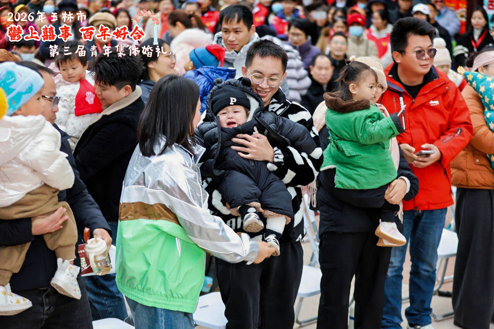 证婚人向新人赠送礼物,新人撒发喜糖传递幸福。合影环节,王琛为往届新人的孩子送上祝福红包,表达长辈的期许,定格玉林“爱与传承”的温馨瞬间。