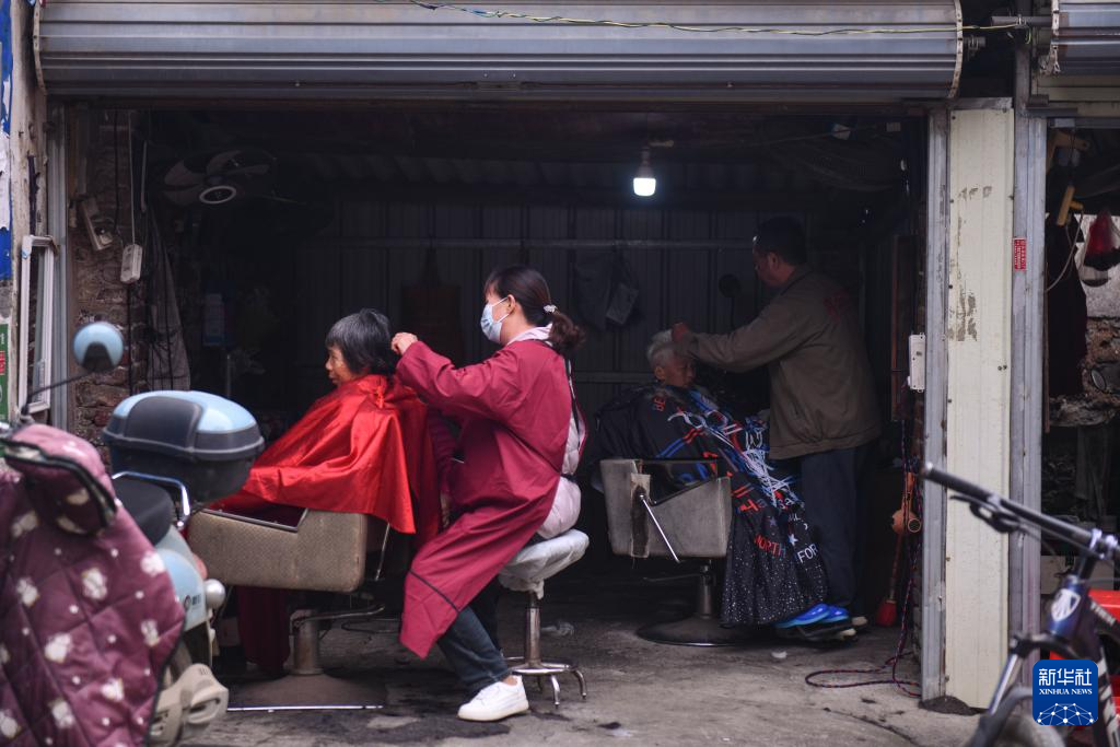 在柳州市柳江区进德镇集市,人们在老街理发店理发(1月29日摄)。