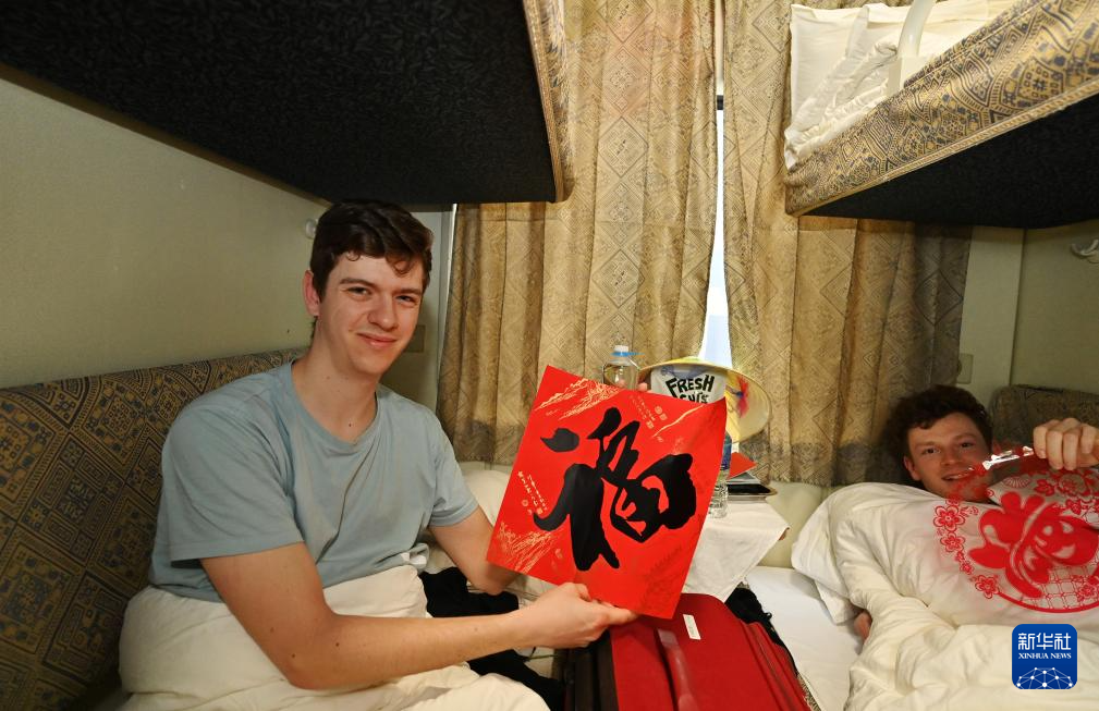 2月11日,中越国际联运旅客列车乘警黄庆明(右)向旅客赠送“福”字表达新春祝福。