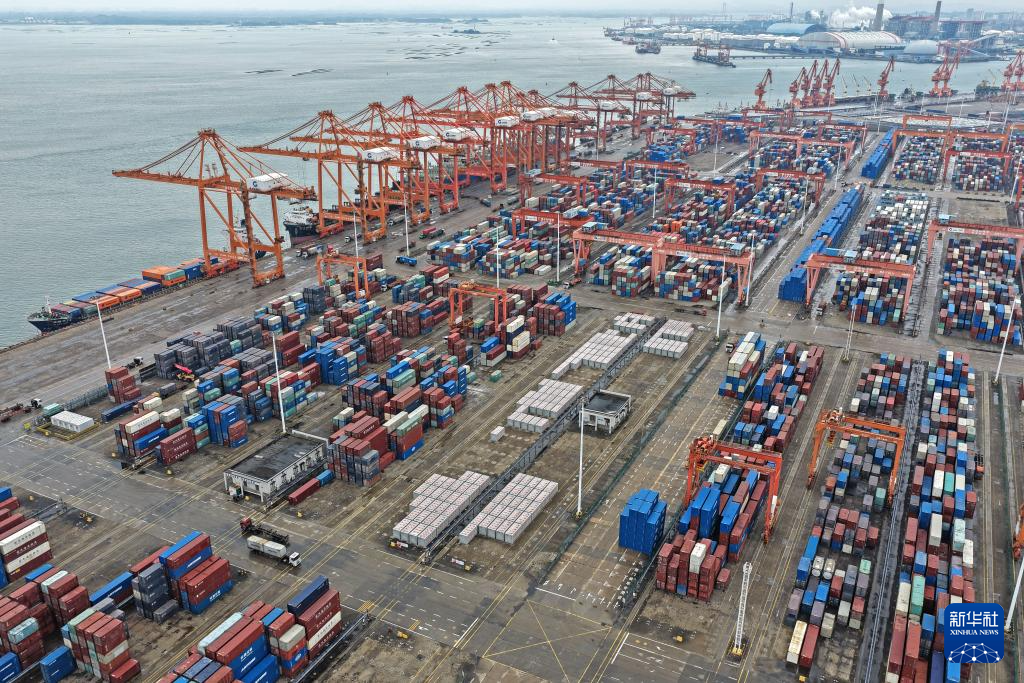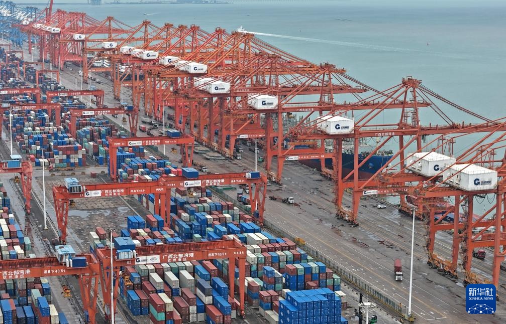 时下,广西北部湾港钦州港区码头桥吊、龙门吊等自动化设备有序运转,车辆来往穿梭,港口货运呈现一派繁忙景象。