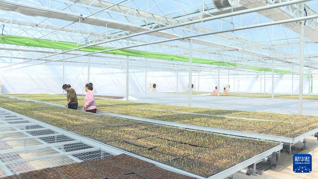 在安徽省安庆市宿松思信农业科技有限公司育苗基地智能温室大棚里,工人们正在有序添加基质、摆放穴盘,经过精准点种的秧盘被送入恒温恒湿的育秧大棚。