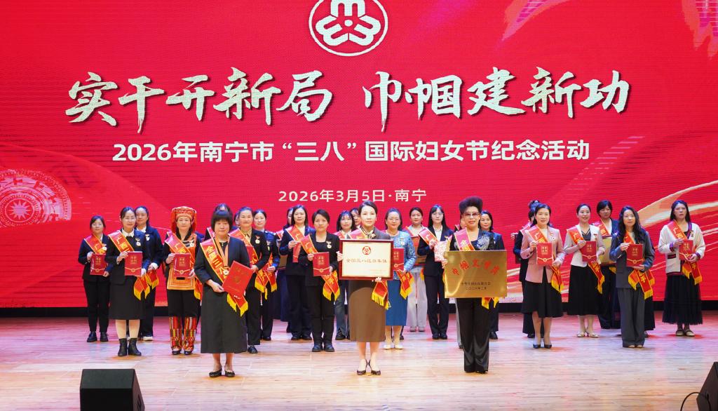 榜样引领新风尚,凝聚奋进正能量。3月5日,南宁市“三八”国际妇女节纪念活动在南宁市妇女儿童活动中心举行,为2025年度全国三八红旗手、全国三八红旗集体、全国巾帼文明岗以及2026年广西三八红旗手标兵等先进典型颁奖。2025年度全国三八红旗手代表李潮、广西三八红旗手标兵蒋三努等优秀女性代表分享了她们坚守岗位、攻坚克难、干事创业的奋斗故事。