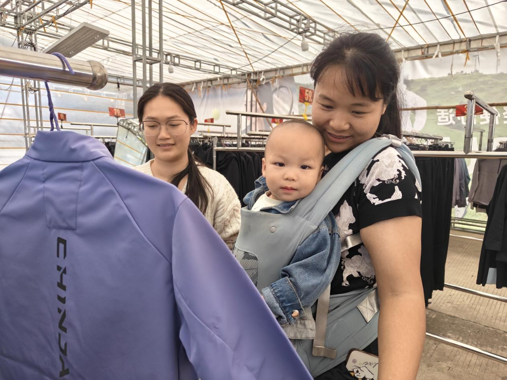 图为顾客在挑选园区生产的服装。