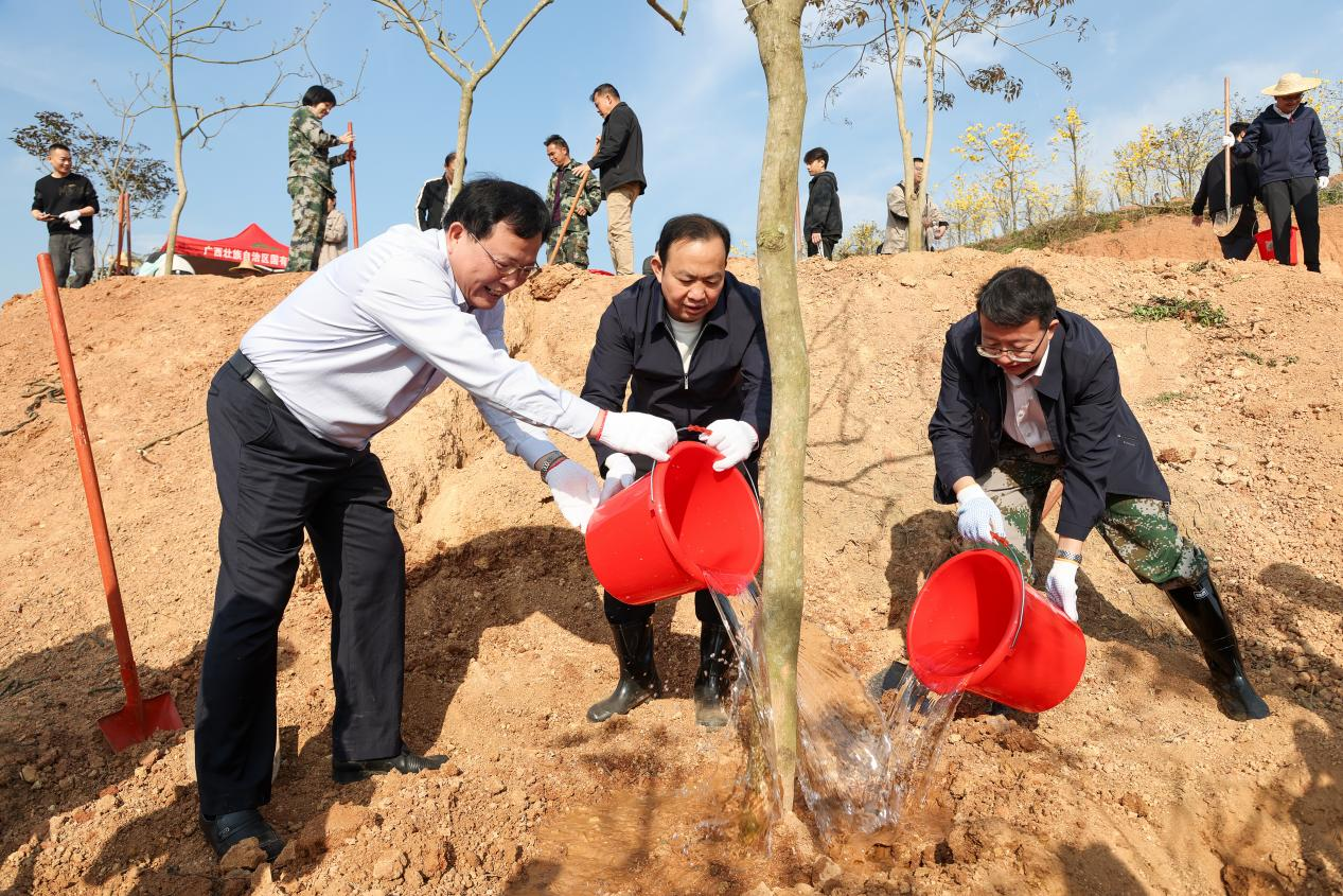 据悉,此次活动优选适配南宁本土气候、生态价值高的苗木品种,共栽种紫花风铃木、黄花风铃木、花石榴等果树、乡土绿化树苗300株,种植面积达5亩。