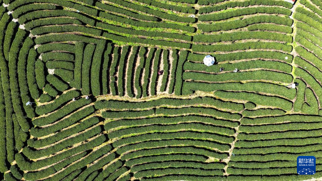 3月12日,三江侗族自治县良口乡燕茶村,当地群众在采摘早春茶(无人机照片)。