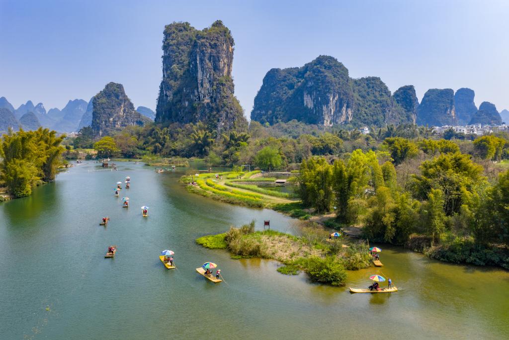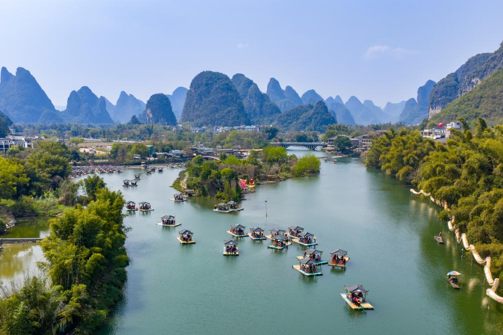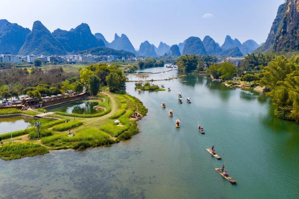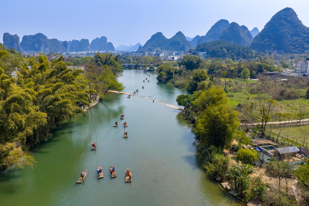 以上图片:2026年3月14日,游客在广西桂林市阳朔县遇龙河万景码头河段游玩。(无人机照片)CICPHOTO/黄胜林 摄