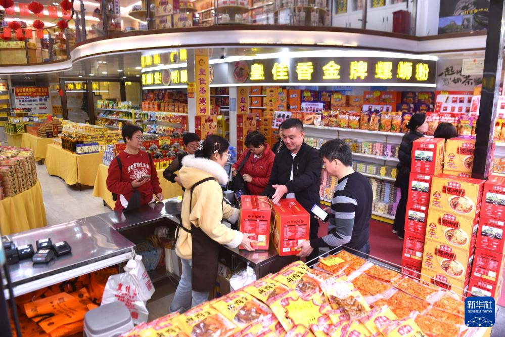 在广西柳州市青云民生市场一家特产超市,游客在选购螺蛳粉(2026年3月10日摄)。