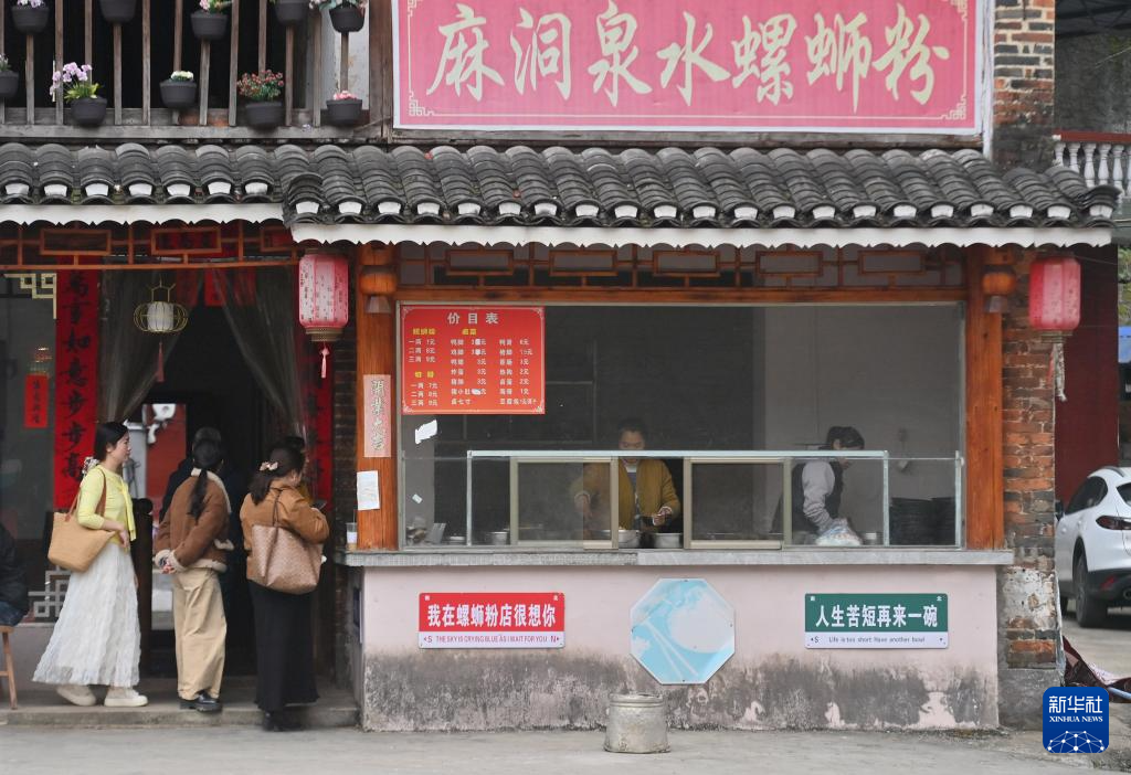 游客在广西融水苗族自治县融水镇新国村一家螺蛳粉店排队购买螺蛳粉(2026年3月7日摄)。