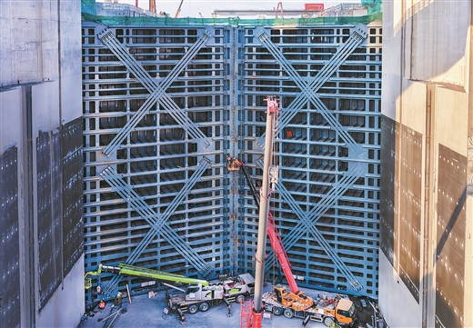 3月18日,记者走进马道枢纽,只见工程吊篮悬于半空,工人紧贴门体施工,渺小身影与巍峨闸墙形成强烈反差,一柔一刚间,更显工程壮阔与建设者的坚守。