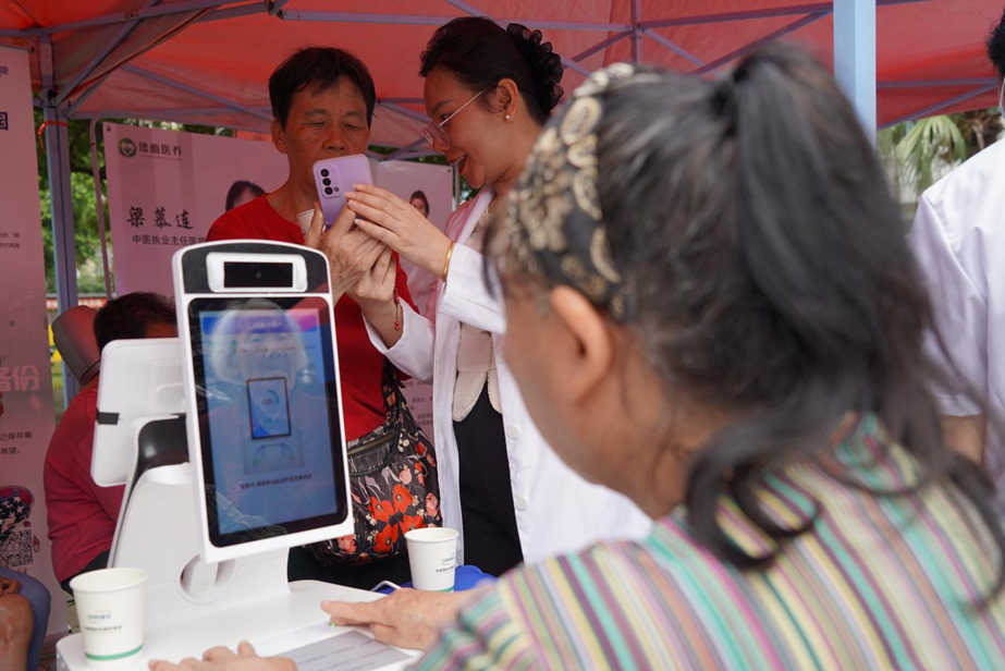 在活动现场,居民在智慧康养板块展位体验智能中医问诊、AI辅助诊疗设备、多参体征监测仪等产品。AI中医脉象体测仪采集面相、舌诊和脉象数据后,仅需3分钟即可将健康报告发送到手机,并附有针对性的饮食、作息、运动调理建议。