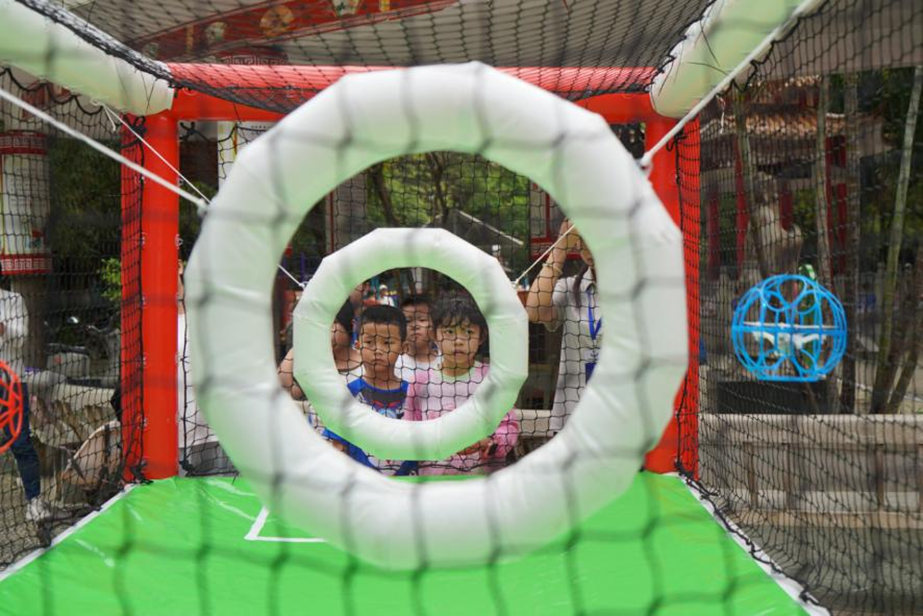 小朋友们在体验无人机足球飞行。