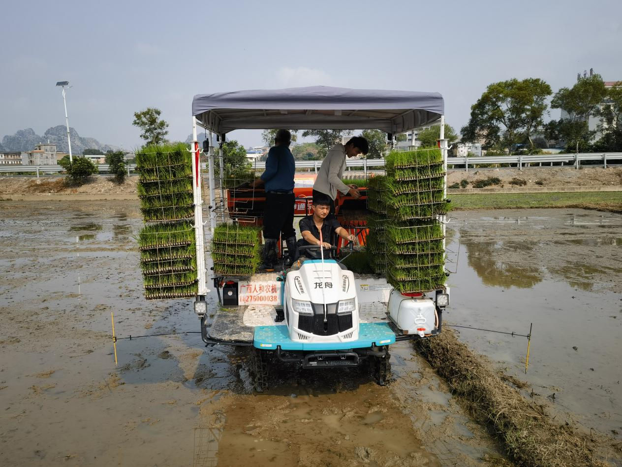 近日,在北流市塘岸村的农机春耕现场,耙田机、无人机、抛秧机一齐上阵,各司其职,呈现出一幅现代化的春耕景象。今年春耕首次亮相的两台水稻抛秧机,引来众多群众近距离围观。农机手聂第安说:“这台新机每天作业8小时,大概能抛秧40亩左右。”