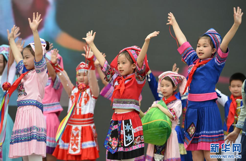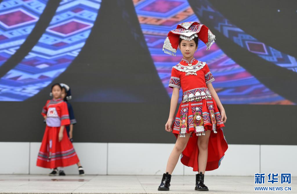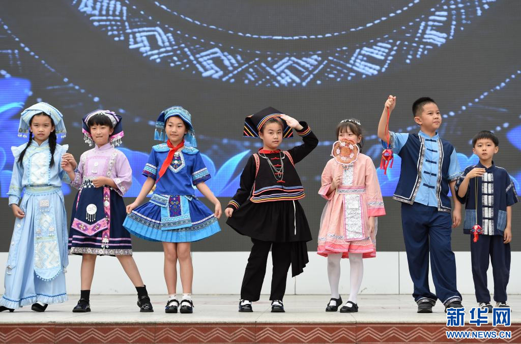 4月13日,广西南宁市滨湖路小学教育集团滨湖校区,学生在表演民族服装秀。