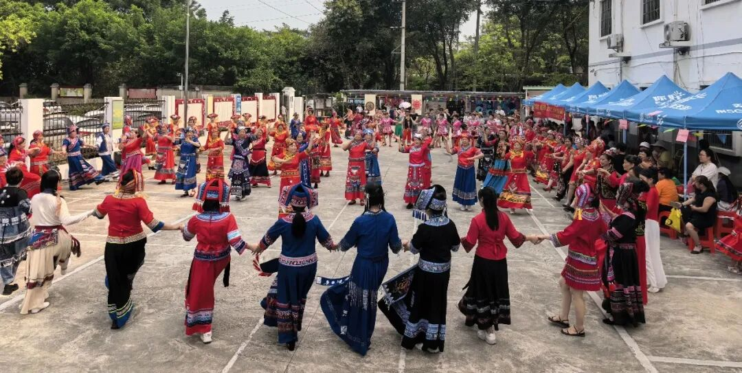活动现场热闹非凡,社区居民身着民族服饰欢聚一堂。竹竿舞节奏明快、集体舞热情洋溢,社区文艺队轮番表演,尽显民族舞蹈魅力,老少同乐、其乐融融。山歌对唱别具特色,社区将反诈、禁毒、移风易俗、民族团结等内容融入山歌,以“刘三姐”“阿牛哥”对唱形式,让文明宣传更接地气、入脑入心。五色糯米饭、油茶、酸嘢等特色美食香气四溢,居民共享美味,共话民族习俗与节日故事。