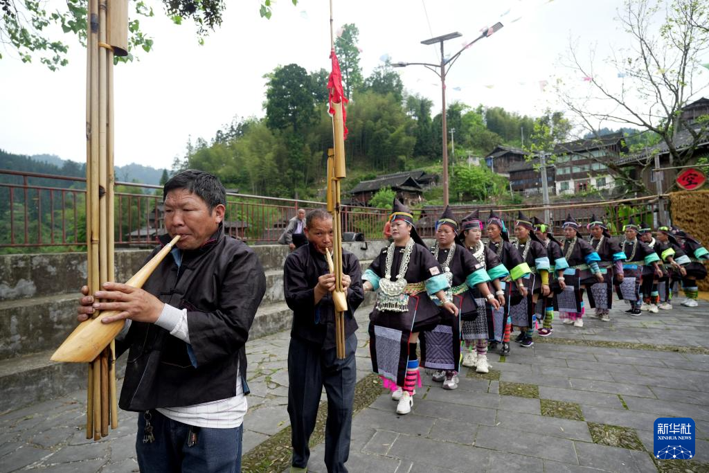 4月19日,在贵州省榕江县两汪乡空申苗寨,苗族群众跳芦笙舞欢度“三月三”。
