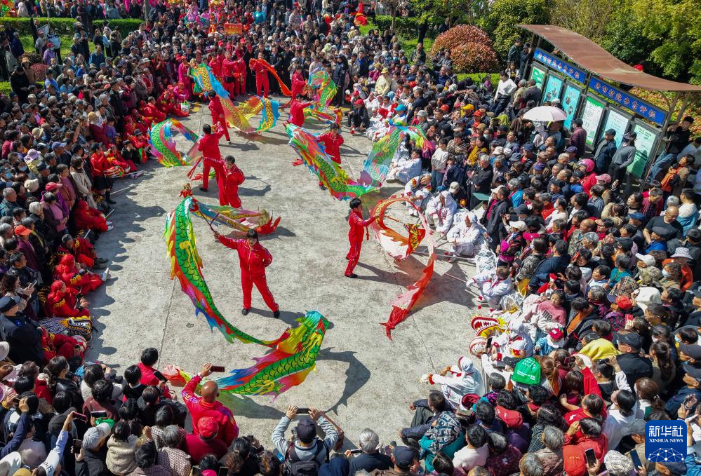 4月19日,村民在江苏省泰州市海陵区唐甸村“三月三”传统庙会上进行舞龙表演(无人机照片)。